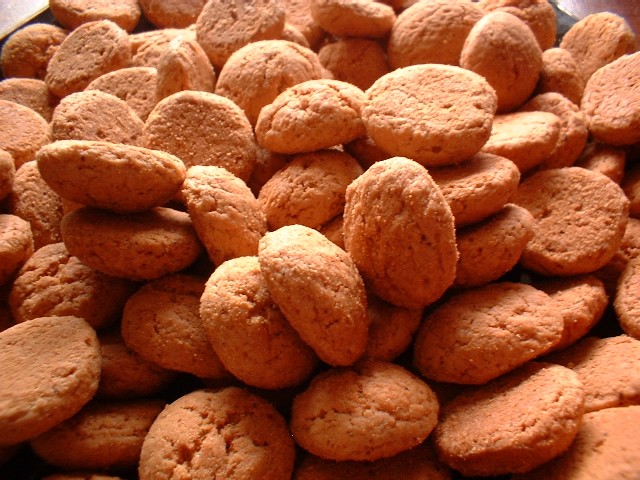 Knead all ingredients into a soft ball. Butter two baking sheets. Form about ninety marble-sized balls and place them on the sheets. Flatten each ball slightly. Bake about 20 minutes in a moderate oven (350° F / 180° C), they will be dark brown, very hard and crunchy when cooled.